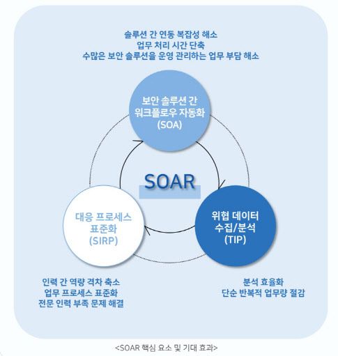 SOAR 기술을 효과적으로 도입하기 위해서는 폭넓은 범주의 보안 요소가 뒷받침돼야 한다. △여러 보안 솔루션 간의 워크플로우를 하나의 과정으로 묶어 자동화하는 `보안 오케스트레이션 및 자동화(SOA)` △일관된 결과를 도출할 수 있게 대응 프로세스를 표준화하는 `보안 사고 대응 플랫폼 (SIRP)`, △위협 데이터를 수집하고 상관 분석해 대응 플랫폼에 연계하는 `위협 인텔리전스 플랫폼(TIP)` 등을 갖추고 이들을 결합할 수 있어야 한다.