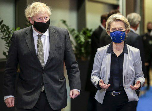 보리스 존슨 영국 총리(왼쪽)와 우르줄라 폰데어라이엔 EU집행위원장(오른쪽)이 지난 9일(현지시간) 벨기에 브뤼셀에 있는 EU 집행위 본부(벨레이몽 빌딩)에서 만나 협상장으로 들어가고 있다./사진=AFP |