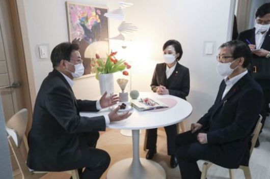문재인 대통령이 지난 11일 오전 경기 화성시 LH 임대주택 100만호 기념단지인 동탄 공공임대주택에서 김현미 국토교통부 장관, 변창흠 국토교통부 장관 후보자(현 LH 사장)와 함께 단층 세대 임대주택을 살펴본 뒤 대화하고 있다. [이미지출처=연합뉴스] |
