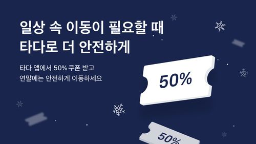 타다 앱에서 할인쿠폰을 받아 타다 호출 시 사용하면 된다. 연말까지 횟수 제한 없이 사용할 수 있다.