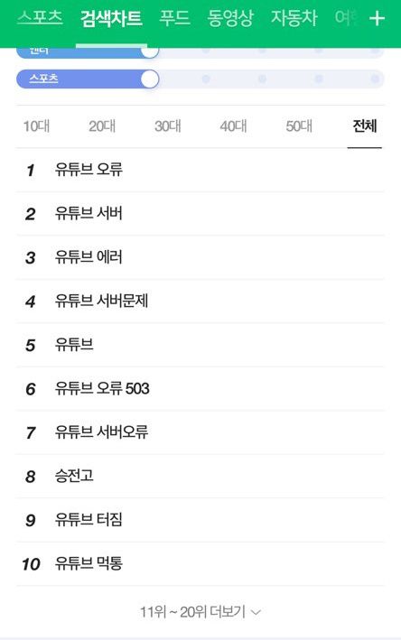이날 오후 9시 20분 기준 한 포털사이트 실시간 검색어에는 '유튜브 오류' '유튜브 서버' '유튜브 503' '유튜브 에러' '유튜브 안됨' '유튜브 접속' '유튜브 서버문제' 등이 올랐다.