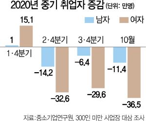 14일 중소기업연구원에 따르면 올 2·4분기부터 10월까지 300인 미만 사업장의 여성 취업자는 전년 동기 대비 98만 7,000명 줄었다. 반면 남자 취업자의 감소 폭은 32만명 수준이었다. 여성 취업자 감소 폭이 남자 대비 3배가량 많은 것이다. 특히 10월은 한 달 만에 여성 취업자 감소가 36만 5,000명이나 됐다. 올 1·4분기만 해도 여성 취업자는 15만명 넘게 증가해 남성(1만명 증가)을 압도했다.