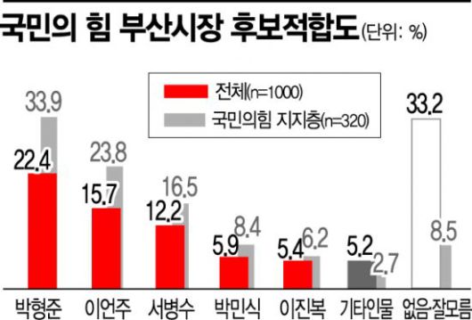 [아시아경제 원다라 기자] 부산시민들이 국민의힘에선 박형준 동아대 교수, 더불어민주당에선 김영춘 국회 사무총장이 차기 부산시장으로 적합하다고 생각하는 것으로 나타났다.