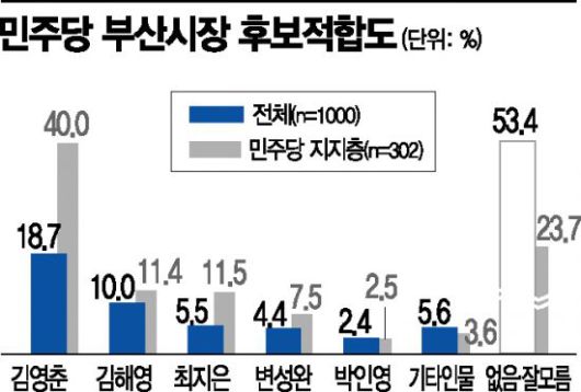민주당 후보군 중에선 김 사무총장(18.7%)이라는 응답이 가장 많았고 김해영 전 의원(10%), 최지은 민주당 국제대변인(5.5%), 변성완 부산시장 권한대행(4.4%), 박인영 전 부산시의회 의장(2.4%) 순이었다.