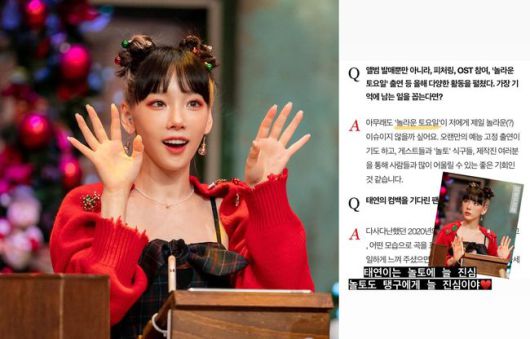 뿐만 아니라 '놀라운 토요일' 측은 오늘(15일) 신곡 발매를 앞두고 소속사를 통해 공개한 태연의 인터뷰 내용을 캡처, "태연이는 놀토에 늘 진심. 놀토도 탱구에게 늘 진심이야"라고 말해 화제를 모았다.