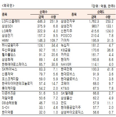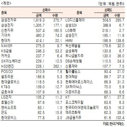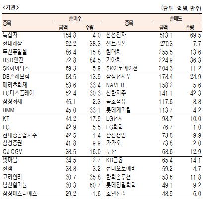[표]유가증권 기관·외국인·개인 순매수·도상위종목 (12월 15일-최종치)