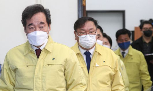 더불어민주당 이낙연 대표와 김태년 원내대표가 16일 오전 서울 여의도 국회에서 열린 최고위원회의에 참석하고 있다. 뉴시스 |