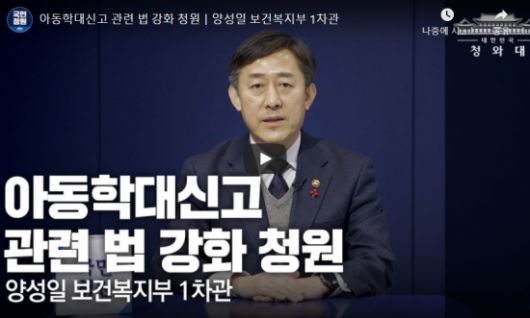 지난 10월 제기된 이번 청원은 생후 16개월에 불과한 영아가 양부모로부터 장기간 학대를 당해 숨진 사건과 관련해 '여러 차례의 신고에도 불구하고 아동이 보호받지 못하고 세상을 떠나는 일이 다시는 일어나지 않도록, 피해아동을 즉시 분리해 보호할 수 있는 법을 마련해 달라'는 취지로 제기됐다. 청원에는 약 20만8000명의 국민이 동의했다.
