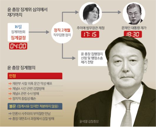 문재인 대통령이 16일 이른바 ‘추·윤 사태’ 출구전략에 나섰다. 문 대통령은 이날 법무부 징계위원회의 윤석열 검찰총장 정직 2개월 결정을 14시간 만에 재가했다.