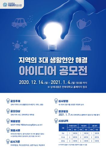 (전주=연합뉴스) 정경재 기자 = 전북대는 지역 3대 생활 현안(미세먼지, 악취, 교통 문제) 해결을 위한 아이디어를 공모한다고 17일 밝혔다.