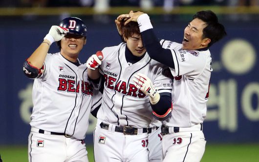 2019 한국시리즈 2차전에서 박건우(가운데)의 끝내기 안타가 터진 뒤 정수빈(왼쪽)과 허경민이 축하를 해주는 모습. / 연합뉴스 |
