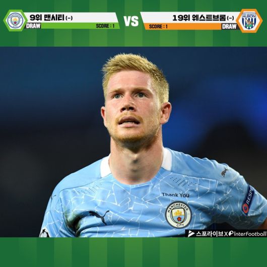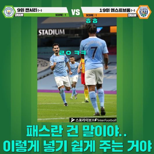 맨시티가 꼭 잡아야할 경기를 놓쳤다. 맨시티는 약체인 WBA을 상대로 제주스, 스털링, 더 브라위너, 포든, 귄도간 등 주축 선수들을 총 투입하며 승리를 노렸고, 전반 30분 스털링이 우측면에서 컷백을 내줬고 귄도간이 오른발 슈팅으로 선제골을 터뜨리며 리드를 잡았다. 그러나 리드는 오래가지 않았다. 전반 42분 세트피스 상황에서 웨스트브로미치의 수비수 아자이가 공을 받은 뒤 슈팅을 시도했고 이것이 굴절되면서 동점골로 연결됐다. 이로써 전반전은 1-1로 종료됐다.