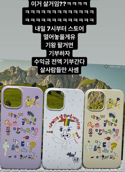 18일 이영지는 인스타그램 스토리를 통해 “이거 살 거냐. 기왕 팔 거면 기부하자. 수익금 전액 기부 간다. 살 사람들만 사라”며 자신이 직접 제작한 폰케이스를 올렸다.