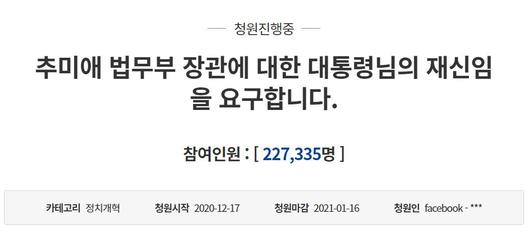 한 청원인은 지난 17일 “현 정부의 주요 개혁과제인 검찰개혁의 성공적인 완성을 위해 추미애 현 법무부 장관에 대한 대통령님의 재신임을 요구한다”는 글을 올렸다. 이 청원인은 “이미 청와대를 대상으로까지 수사권과 기소권을 남용해서 연성쿠데타를 시도한 윤석열 검찰 총장 이하 검찰 수뇌부들은 여전히 개혁에 저항하는 모습을 보이고 있다”며 “자칫 현재까지 힘들게 쌓아온 검찰개혁의 공든 탑이 무너질 수도 있는 위험한 상황”이라고 했다. 그러면서 “전임자였던 조국 전 법무부 장관이 개혁에 저항하는 검찰조직의 불법적인 검찰권 남용에 의해 본인을 포함한 가족 모두가 인권과 명예가 심각하게 실추된 상황”이라고도 했다.