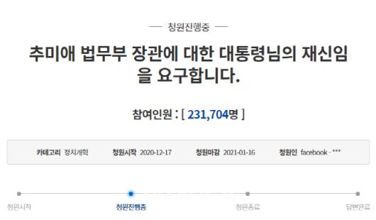 17일 청와대 국민청원 게시판에는 ‘추미애 법무부 장관에 대한 대통령님의 재신임을 요구합니다’라는 제목의 청원 글이 올라왔다. 이 글은 추 장관이 문재인 대통령에게 사의를 표명한 다음 날 올라왔다.