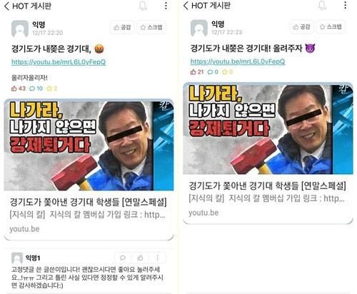 도에 따르면 경기대 기숙사가 코로나19 생활치료센터로 결정되면서 학교 커뮤니티 '에브리타임'의 익명 게시판과 인터넷 포털사이트 등에 '도가 학생들을 강제로 내쫓았다'는 내용의 유튜브 영상이 게시되거나 이 지사를 비난하는 악성 댓글이 연달아 달렸습니다.