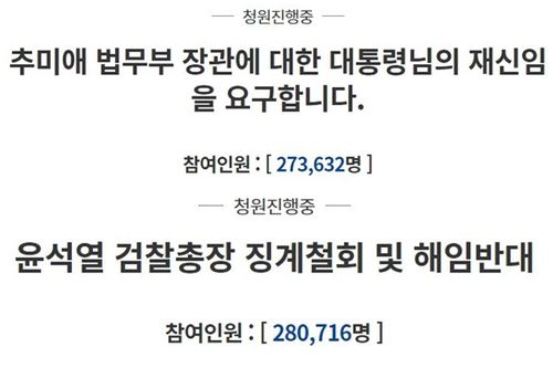 추 장관의 재신임을 요구하는 청원과 윤 총장의 징계 철회 및 해임 반대를 요구하는 청원에 참여한 인원은 19일 모두 20만명을 훌쩍 넘겼다.