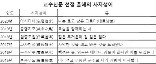 교수신문은 매년 교수 설문조사를 통해 올해의 사자성어를 선정하고 있다. 2019년에는 '공명지조(共命之鳥)'가 선정됐다. 불교 경전에 등장하는 한 몸에 머리가 두 개 달린 새를 뜻하는 말로, '목숨을 함께하는 새'라는 의미다. 한국 사회 좌우 대립을 우려하는 뜻을 담았다. 2018년에는 '짐은 무거운데 갈 길은 멀다'는 뜻인 '임중도원(任重道遠)'이 선정됐다.