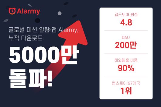 IT 스타트업 딜라이트룸의 글로벌 미션 알람 앱 ‘알라미’의 전 세계 누적 다운로드가 5000만 건을 넘어섰다.