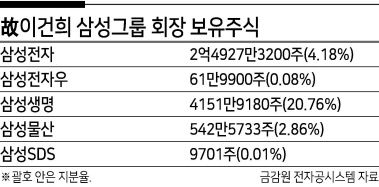이 회장의 유족은 부인 홍라희 전 리움미술관 관장과 아들 이재용 삼성전자 부회장, 딸 이부진 호텔신라 사장, 이서현 삼성복지재단 이사장 등이 있다. 이 부회장을 비롯해 유족들이 막대한 상속세를 마련하기 위해 특별배당 등 계열사의 배당을 확대할 수 있다는 관측이 나온다.