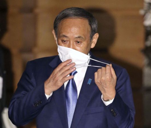 스가 요시히데(菅義偉) 일본 총리가 지난 16일 오후 일본 총리관저에서 기자들의 취재에 응하며 마스크를 벗고 있다. 연합뉴스 |