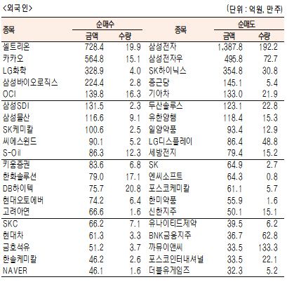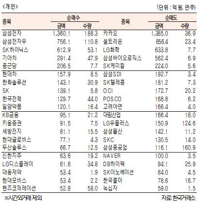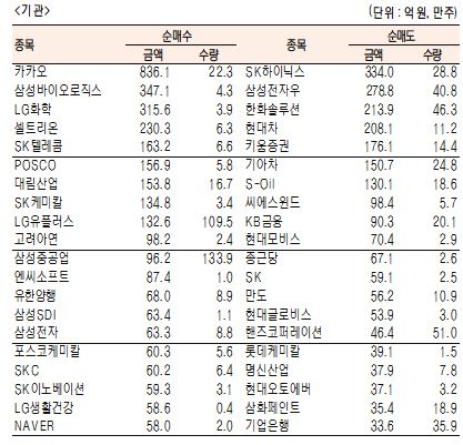 [표]유가증권 기관·외국인·개인 순매수·도 상위종목(12월 21일)