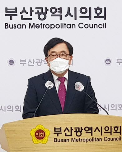 서병수 국민의힘 의원이 21일 부산시의회 브리핑룸에서 기자회견을 열고 내년 부산시장 보궐선거 불출마를 선언하고 있다.(사진=연합뉴스) |