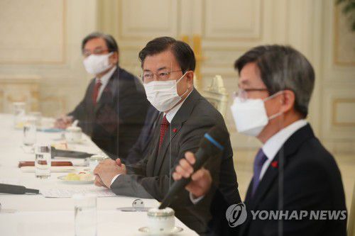 (서울=연합뉴스) 임형섭 기자 = 문재인 대통령은 22일 오전 청와대로 박병석 국회의장, 김명수 대법원장, 유남석 헌법재판소장, 정세균 국무총리, 노정희 중앙선거관리위원장 등 5부 요인을 초청해 간담회를 했다.