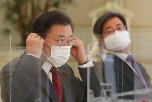 문재인 대통령이 22일 오전 청와대에서 열린 '5부요인 초청 간담회'에서 발언을 마친 뒤 마스크를 쓰고 있다. 오른쪽은 김명수 대법원장.[연합뉴스] |