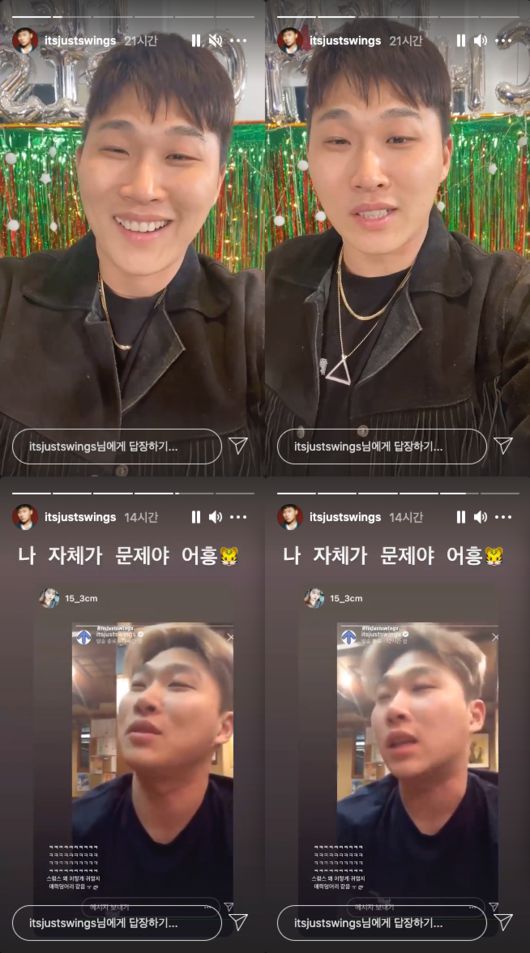 스윙스는 23일 자신의 인스타그램 스토리에 “저스트뮤직 오늘 성탄절 우리만의 행사. 놀러왔다. 다들 있어. 다들 나와서 부수길. 오늘 밥 두 공기 먹었어 엑스 됐어”라는 영상 메시지를 남겼다.