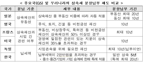 재계는 분할납부 조건을 적용해도 기업들의 부담감이 큰 것을 문제로 지적하고 있다. 실제 일본·영국·미국·프랑스·독일에서는 기업에 대한 상속세 분할은 최대 10년 분납까지도 허용하고 있다.