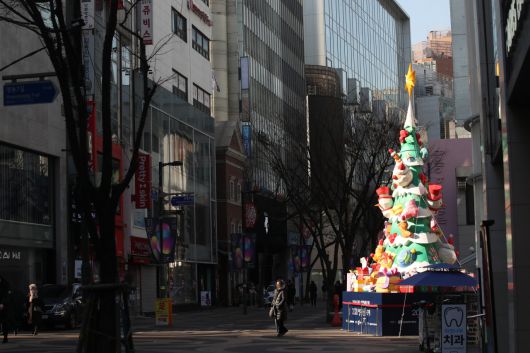 성탄절과 새해 연휴를 앞둔 지난 21일 서울 중구 명동예술극장 앞. 대형 크리스마스 트리가 눈에 띈다. [연합] |