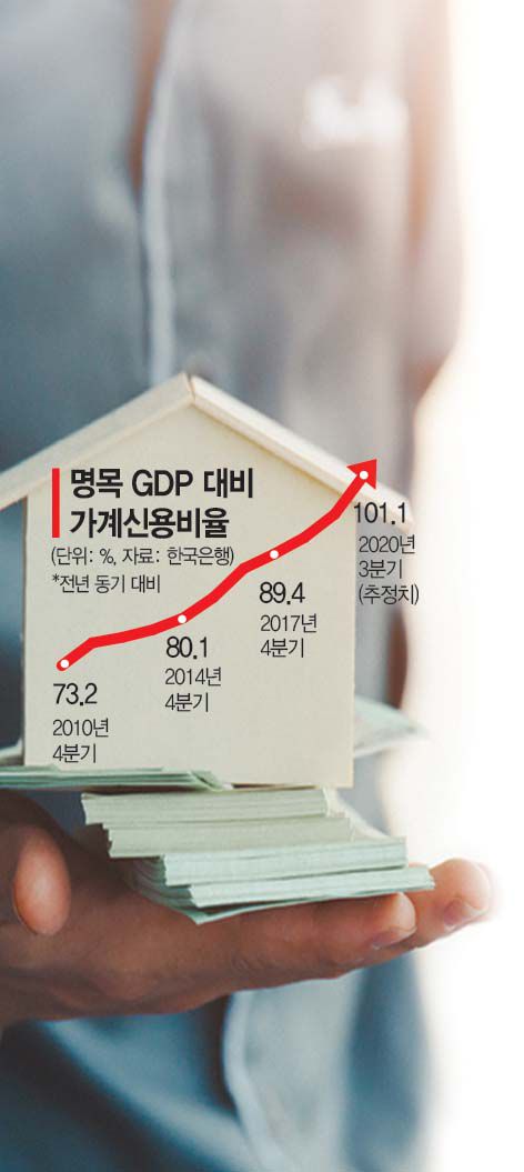 24일 한국은행이 국회에 제출한 '2020년 하반기 금융안정보고서'에 따르면 3분기 말 기준 명목 GDP(연 단위 추산) 대비 가계대출 비율은 101.1%로 전년 동기 대비 7.4%포인트 상승했다. 명목 GDP 대비 가계대출 비율이 100%를 넘은 것은 이번이 처음이다.