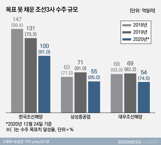 연말에 수주가 되살아나고 있지만 '수주 잭팟이 터졌다'고 표현할 정도는 아니다. 막판 수주에도 연초 세운 목표치를 달성하긴 쉽지 않다. 한해 마감을 한 주가량 앞둔 현재 수주 목표 달성률은 한국조선해양 91%, 대우조선해양 74.5%, 삼성중공업 65% 가량이다. 한국조선해양의 달성률이 가장 높지만 지난달 수주 목표를 대폭 낮춘 것을 감안하면 만족할 성적은 아니다. 관련기사☞'수주가뭄-실적악화' 조선 악순환 내년에도…