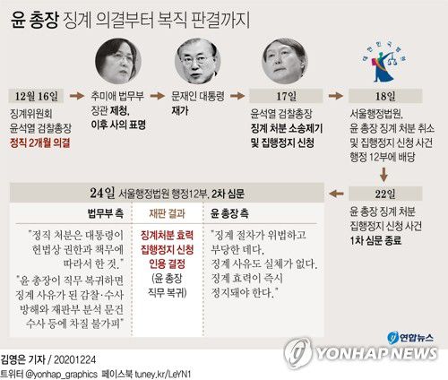 서울행정법원 행정12부(홍순욱 부장판사)는 24일 윤 총장이 추미애 법무부 장관을 상대로 신청한 징계처분 효력 집행정지 신청을 일부 받아들였다.