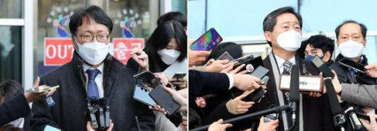 법무부 측 변호인 이옥형 변호사(왼쪽)와 윤석열 검찰총장 측 변호인 이석웅 변호사가 24일 오후 서울행정법원에서 열린 윤 총장에 대한 정직 처분 집행정지 재판 2차 심문을 마친 뒤 취재진의 질문에 답하고 있다. 연합뉴스 |