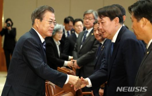 문재인 대통령이 지난해 11월8일 청와대 본관 집현실에서 열린 공정사회를 향한 반부패정책협의회에 참석해 윤석열 검찰총장과 인사를 나누고 있다. |