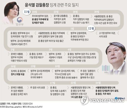 (서울=연합뉴스) 박형빈 기자 = 윤석열 검찰총장에 대한 '정직 2개월' 징계 처분의 효력을 정지하는 법원의 결정이 나왔다.