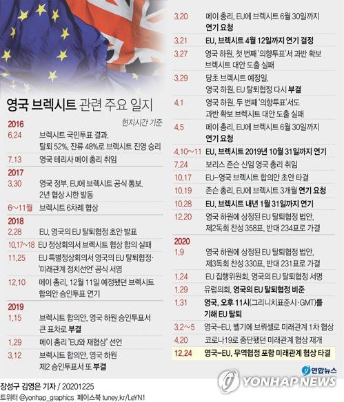(런던·브뤼셀=연합뉴스) 박대한 김정은 특파원 = 영국과 유럽연합(EU)이 자유무역협정을 포함한 미래관계 협상을 극적으로 타결했다.