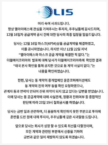한편 엘아이에스 측은 글로벌 제지 기업 더블에이인 줄 알고 계약을 체결했지만 23일 계약의 진위를 확인하는 과정에서 연락이 닿지 않으면서 철회 결정을 내렸다고 밝혔다. ‘작년 매출의 7배에 육박하는 규모의 계약에 대한 사전 검증이 부족했던 것 아니냐’는 질문에 대해 엘아이에스 측은 “검토가 부족했던 부분에 대해서는 (책임을) 통감하고 있다”면서도 “계약이 한두달 새 이뤄진 것이 아니며 확인을 하기 위해 최대한 노력했다”고 말했다. 이어 “23일 연락이 끊기고 계약금이 안 들어오니 계약 상대가 실재하지 않을 수 있겠다는 생각을 했다”며 “중개업체인 윤준코퍼레이션을 대상으로 법적 대응을 할 것”이라고 했다.
