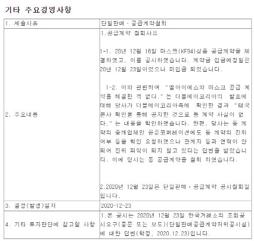 현재 주식시장에서는 ‘마스크를 1조 원어치 파는 게 가능하겠냐’, ‘부업으로 매출액의 7배를 올렸다는 수주를 순진하게 믿냐’ 등 개인 투자자를 향한 비판이 나오고 있지만, 이들도 할 말은 많아 보인다. 이들이 믿은 건 떠도는 증권가 풍문이 아닌 금감원과 거래소가 운영하는 공식 소통 채널의 ‘전자 공시’였기 때문이다. 더구나 거래소가 직접 계약서의 진위를 확인한 뒤 공시를 내보내고 있다. 개인 투자자 입장에서는 믿는 도끼에 발등 찍혔다는 항변이 나올 법하다.