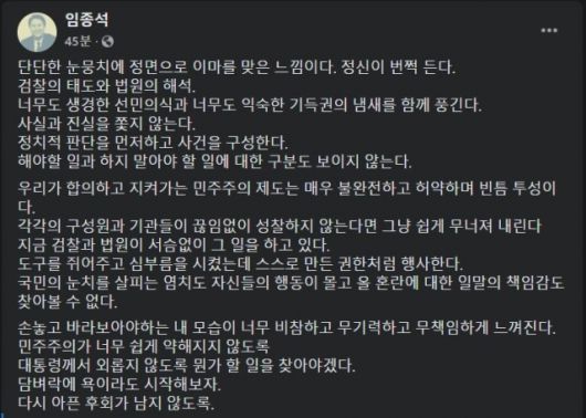 임 전 실장은 “국민의 눈치를 살피는 염치도, 자신들의 행동이 몰고 올 혼란에 대한 일말의 책임감도 찾아볼 수 없다”면서 “손 놓고 바라보아야 하는 내 모습이 너무 비참하고 무기력하고 무책임하게 느껴진다”고 했다. 그러면서 “민주주의가 너무 쉽게 약해지지 않도록 대통령께서 외롭지 않도록 뭔가 할 일을 찾아야겠다”고 했다.