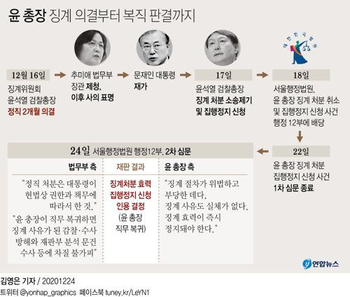 서울행정법원 행정12부(홍순욱 재판장)는 24일 오후 10쯤 윤 총장이 제기한 징계 2개월에 대한 집행정지를 인용했다. 이는 ‘본안 소송’으로 불리는 징계 처분 취소에 관한 1심 소송 판결 선고일로부터 30일까지 효력이 발생한다.