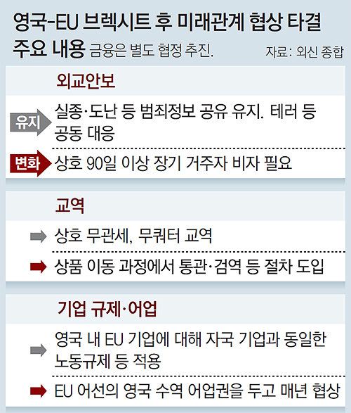 이번 협상에서 가장 관심을 끌었던 분야는 단일시장 수준의 FTA가 유지되느냐였다. 양측은 단일시장과 마찬가지로 무관세, 무쿼터(무관세가 적용되는 상품에는 수량에 제한을 두지 않음)를 유지하기로 했다. 양자 간 교역 규모는 2019년 기준 6680억 파운드(약 1003조 원)에 달한다. 다만 단일시장과는 달리 별도의 검역과 통관 절차를 거쳐야 하는 만큼 앞으로 구체적인 기준을 마련해야 한다.