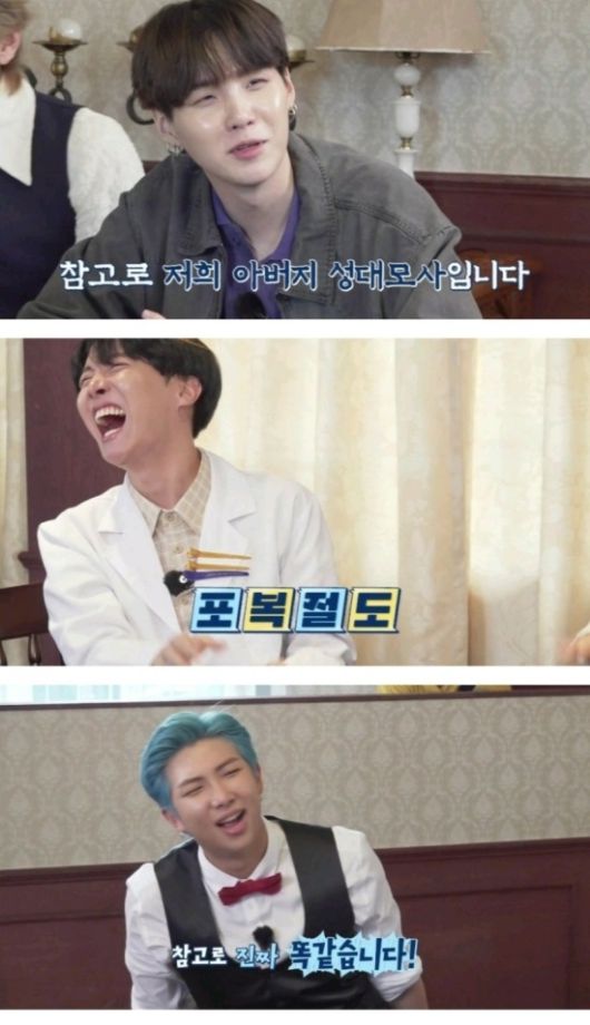정국의 모습에 슈가는 "참고로 저희 아버지 성대모사입니다"라 말했고 RM은 "참고로 진짜 똑같습니다!"라 거들며 현장을 포복절도하게 만들었다.
