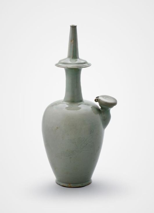 청자 음각 앵무문 정병. 12세기 고려청자 정병의 전형적인 형태를 보이는 이 작품은 존 세브란스가 1921년에 미 클리블랜드미술관에 기증한 작품이다. 몸체에 가는 음각선으로 세 마리의 앵무새가 표현되어있다. 임수아 학예 연구사 제공 |