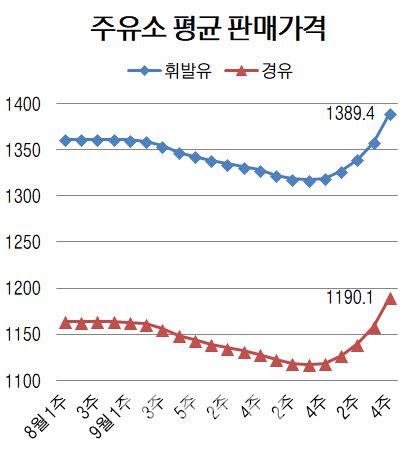 26일 한국석유공사 유가정보서비스 오피넷에 따르면 12월 넷째 주 전국 주유소 휘발유 평균 판매가격은 ℓ당 1389.4원으로 전주보다 31.7원 올랐다.