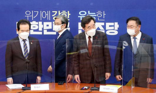 27일 국회에서 열린 더불어민주당과 정부, 청와대의 고위 당·정·청협의회에 정세균 국무총리와 노영민 청와대 비서실장, 민주당 이낙연 대표, 김태년 원내대표(왼쪽부터)가 참석하고 있다. 서상배 선임기자 |