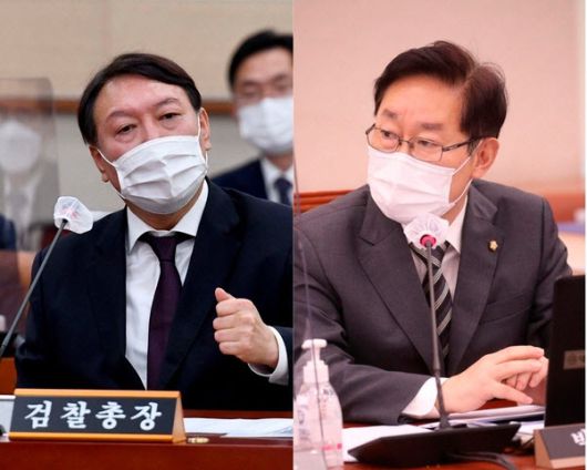 윤석열 검찰총장(왼쪽)과 박범계 더불어민주당 의원 (사진=연합뉴스) |