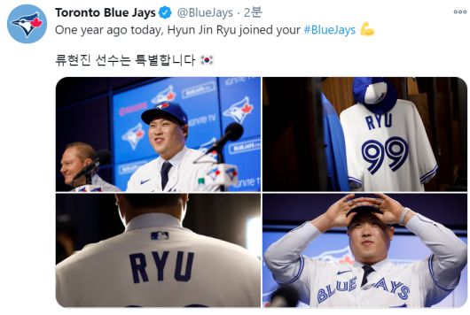 토론토는 28일 오전 구단 공식 SNS에 "1년 전 류현진이 블루제이스에 합류했다"고 설명하며 "류현진 선수는 특별합니다"라는 한글 글씨와 태극기 모양 이모티콘으로 '기념일'을 자축했다.
